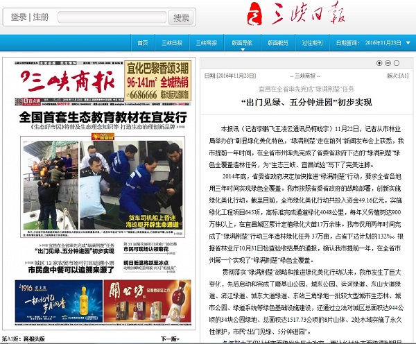 三峡商报:宜昌在全省率先完成“绿满荆楚”任务 “出门见绿、五分钟进园”初步实现
