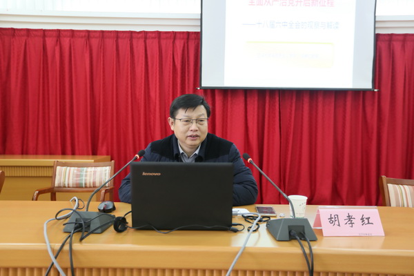 胡孝红围绕党的十八届六中全会主题议程、十八届六中全会的重大意义、落实全面从严治党战略布局的背景考察、十八届六中全会的新思想、新观点、新要求以及学习贯彻十八届六中全会要把握的几个关系等5个方面进行了系统的辅导。他指出,党的十八届六中全会海内外媒体广泛关注的政治峰会,是完善“四个全面”战略总体局的需要,是全面从治党的需要,是抓住和应对国内外机遇与挑战的需要。会议明确确立习近平的核心地位,是自然形成,是走向伟大复兴的需要。对坚定不移推进全面从严治党、全面加强和规范党内政治生活、全面落实党内监督责任、突出抓好领导干部特别是高级干部等进行了宣讲和解读。宣讲主题鲜明、内容丰富,阐述透彻、深入浅出。