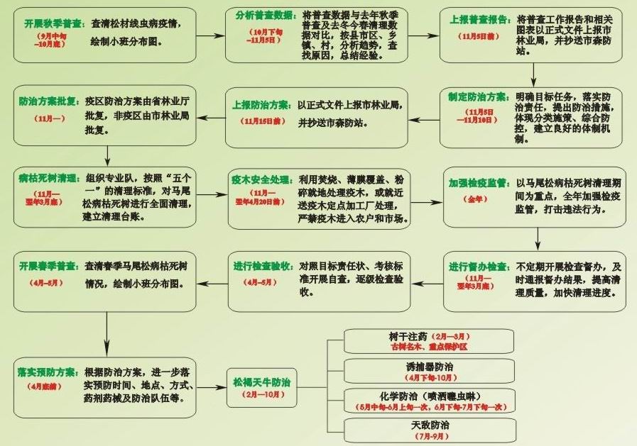 为加强对松材线虫病防治工作指导的针对性,提高防治成效,宜昌市森防站根据有关文件要求和技术标准,结合宜昌实际,制定松材线虫病综合防治时间路线图,并印制1万份分发各地,为各级领导、技术人员、专业防治队伍把握时间节点,明确各阶段的工作内容提供支撑。