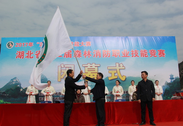 闭幕式上,市森林防火指挥部副指挥长、市林业局党组成员、副局长张松林从省森林防火指挥部办公室主任刘源望手中接过“湖北省森林消防技能竞赛”活动会旗。宜昌市将承办2018年全省第三届森林消防职业技能竞赛。(市防火办 刘文刚)
