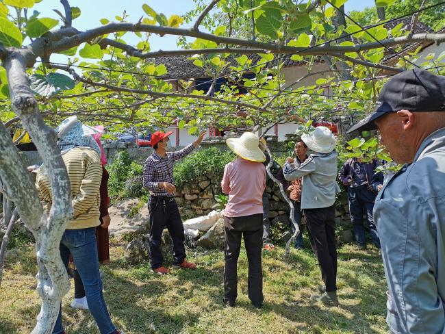 “猕猴桃没有生理性落果,合理的疏花疏果,才能达到丰产、稳产、优质的效果”科技人员刘磊正在示范讲解猕猴桃疏果技术,三峡植物园党员干部在田间开展主题党日活动,让全体党员干部掌握猕猴桃管护标准技术。