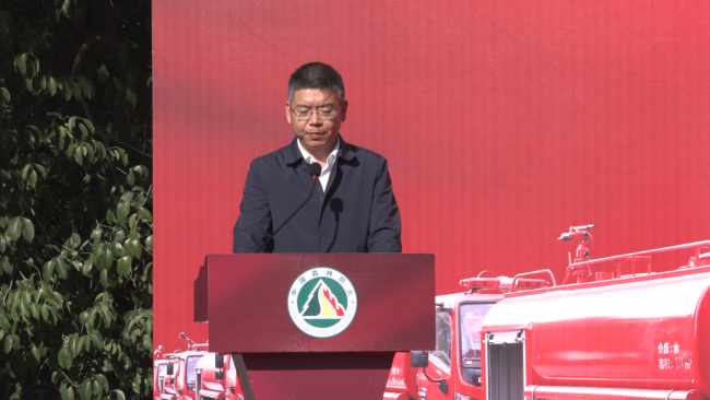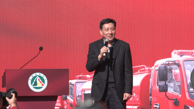 省林业局副局长宋丛文宣布森林消防车整装出发,31辆森林消防车正式交付各地使用。