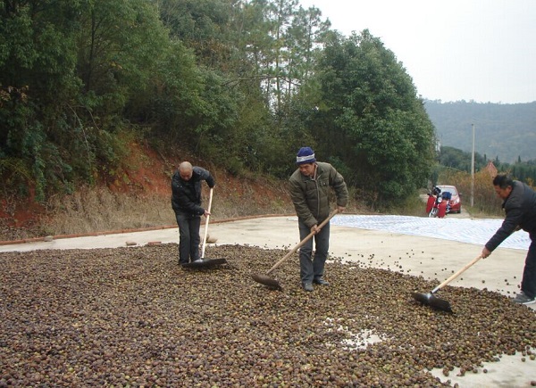 11月27日,笔者随同当阳市林业技术推广中心工程技术人员,来到位于该市原林科所内的油茶采穗圃基地采访时,见到职工正在对已采摘的油茶果实进行晾晒。