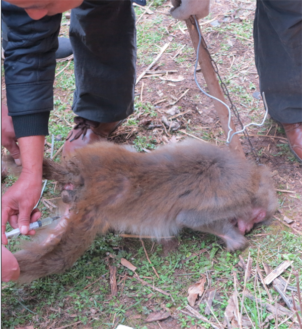 由于猕猴背部受伤,加之在农田食用油菜苔后出现拉稀症状,身体情况虚弱。为避免二次伤害,在请专职兽医进行现场深入救治的基础上,由当地热心村民张卫国在猕猴养伤养病期间暂时收养救助。
