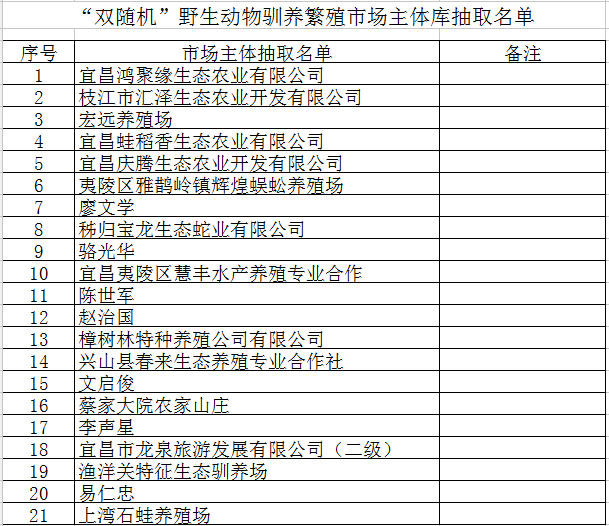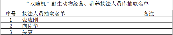 【公示公告】“双随机”抽查(野生动物经营加工、驯养繁殖)市场主体、执法人员抽取结果公示